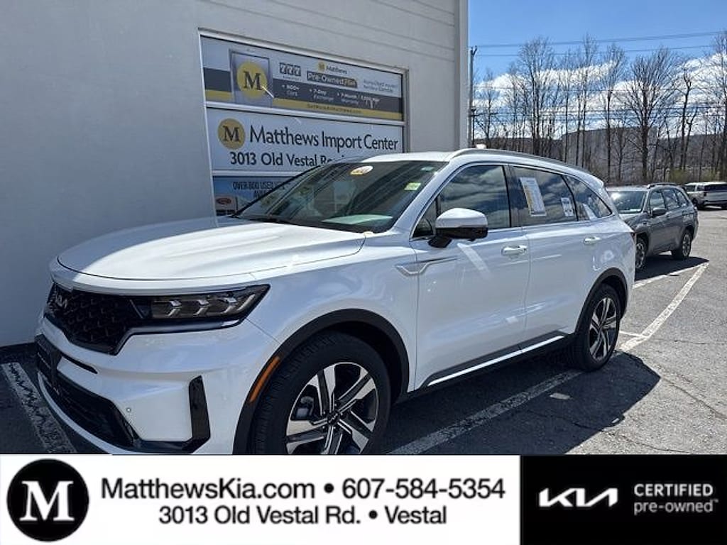 "Matthews Import Center promises each customer a thorough and confident 120-point inspection on our used inventory guaranteeing a relaxing and peace-of-mind experience. We are located behind Lowes in Vestal NY. Or call us at (607) 729 - 6261Matthews Import Center3013 Old Vestal RoadVestal NY 13850. Certified. Snow White Pearl 2023 Kia SX Prestige Sorento Hybrid AWD 6-Speed Automatic 1.6L I4 DGI Hybrid Turbocharged DOHC 16V LEV3-ULEV70Odometer is 11969 miles below market average! 36/33 City/Highway MPGKia Certified Pre-Owned Details: * Limited Warranty: 12 Month/12000 Mile (whichever comes first) ""Platinum Coverage""from certified purchase date * 165 Point Inspection * Roadside Assistance * Includes Rental Car and Trip Interruption Reimbursement. 3 month Sirius trial subscription * Powertrain Limited Warranty: 120 Month/100000 Mile (whichever comes first) from original in-service date * Vehicle History * Transferable Warranty * Warranty Deductible: $50"