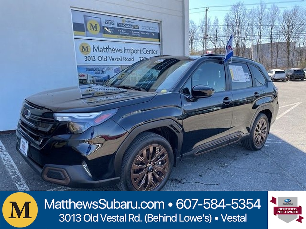 Matthews Import Center promises each customer a thorough and confident 120-point inspection on our used inventory guaranteeing a relaxing and peace-of-mind experience. We are located behind Lowes in Vestal NY. Or call us at (607) 729 - 6261Matthews Import Center3013 Old Vestal RoadVestal NY 13850. Certified. Crystal Black Silica 2025 Subaru Sport Forester Hybrid AWD Lineartronic CVT 2.5L 4-Cylinder DOHC 16VOdometer is 2057 miles below market average! 35/34 City/Highway MPGSubaru Certified Pre-Owned Details: * Vehicle History * Warranty Deductible: $0 * 152 Point Inspection * SiriusXM 3-Month trial subscription $500 Owner Loyalty coupon & 1 year trial subscription to STARLINK * Powertrain Limited Warranty: 84 Month/100000 Mile (whichever comes first) from original in-service date * Roadside Assistance * Transferable Warranty