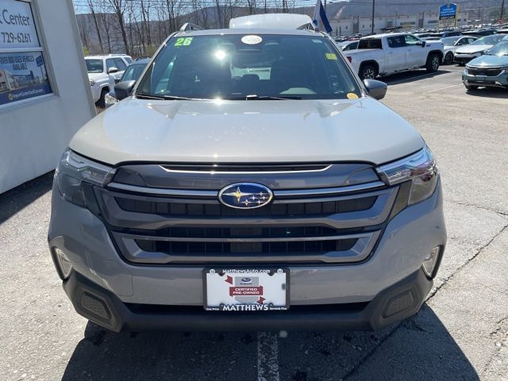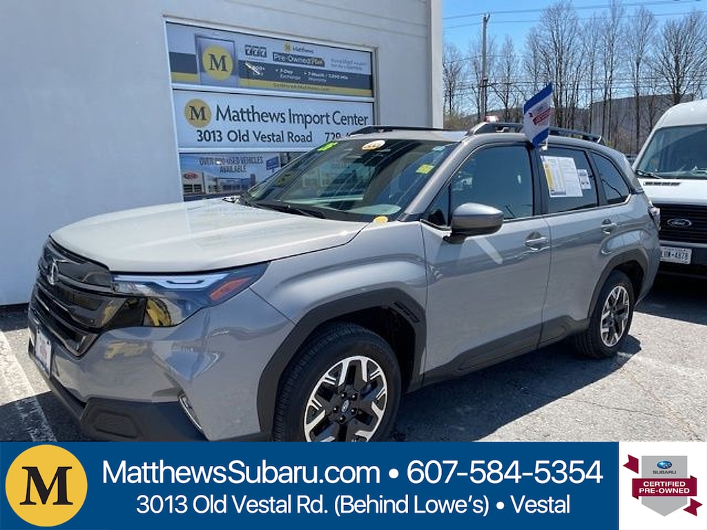 Matthews Import Center promises each customer a thorough and confident 120-point inspection on our used inventory guaranteeing a relaxing and peace-of-mind experience. We are located behind Lowes in Vestal NY. Or call us at (607) 729 - 6261Matthews Import Center3013 Old Vestal RoadVestal NY 13850. Certified. River Rock Pearl 2026 Subaru Premium Forester AWD Lineartronic CVT 2.5L 4-Cylinder DOHC 16VOdometer is 2913 miles below market average! 26/33 City/Highway MPGSubaru Certified Pre-Owned Details: * Powertrain Limited Warranty: 84 Month/100000 Mile (whichever comes first) from original in-service date * Transferable Warranty * SiriusXM 3-Month trial subscription $500 Owner Loyalty coupon & 1 year trial subscription to STARLINK * Warranty Deductible: $0 * 152 Point Inspection * Roadside Assistance * Vehicle History