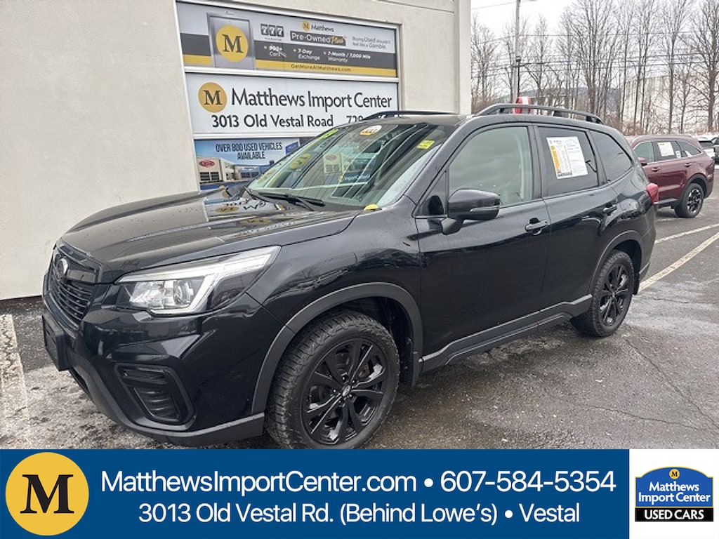 Crystal Black Silica 2019 Subaru Forester Sport AWD Lineartronic CVT 2.5L 4-Cylinder DOHC 16V VVT26/33 City/Highway MPGAwards: * 2019 KBB.com 10 Best SUVs Under $30000 * 2019 KBB.com 10 Best All-Wheel-Drive Vehicles Under $30000 * 2019 KBB.com 12 Best Family Cars * 2019 KBB.com 5-Year Cost to Own Awards * 2019 KBB.com Brand Image AwardsMatthews Import Center promises each customer a thorough and confident 120-point inspection on our used inventory guaranteeing a relaxing and peace-of-mind experience. We are located behind Lowes in Vestal NY. Or call us at (607) 729 - 6261 Matthews Import Center 3013 Old Vestal Road Vestal NY 13850.Odometer is 13638 miles below market average!