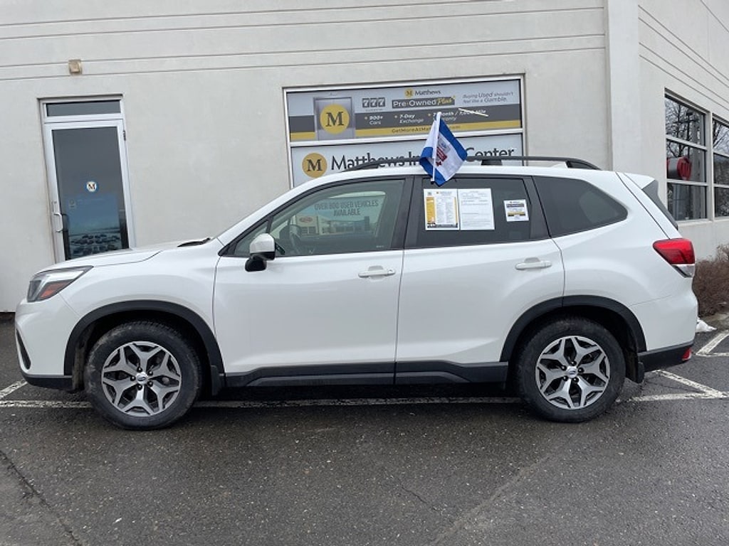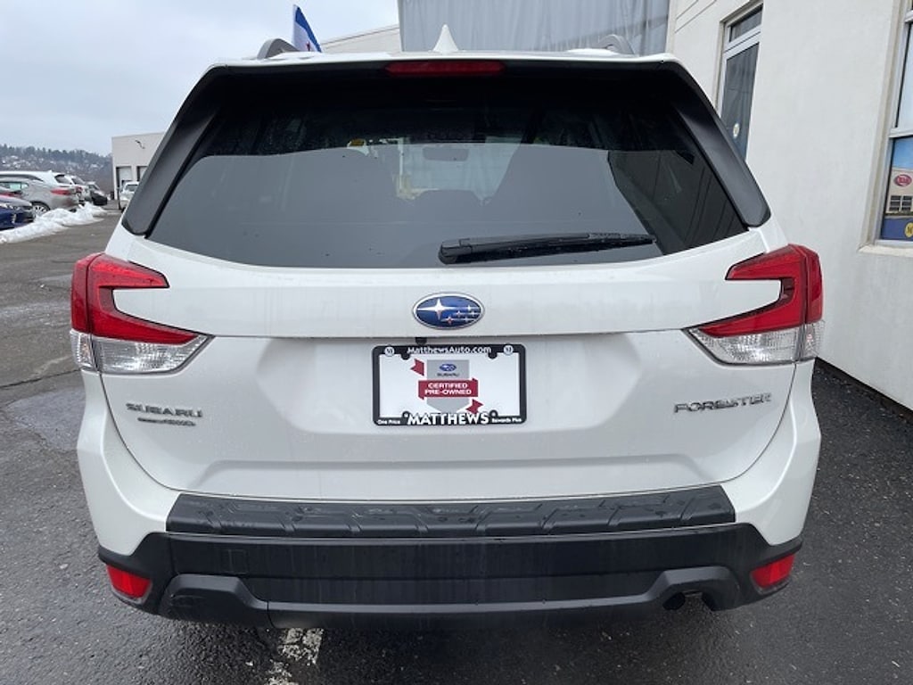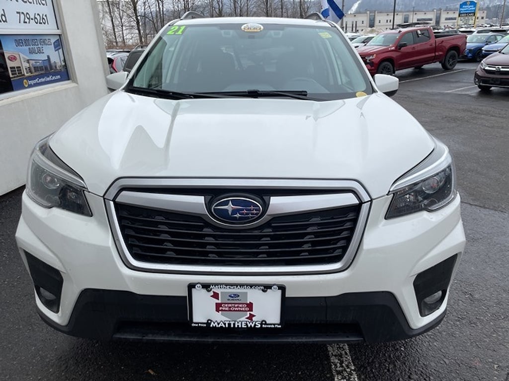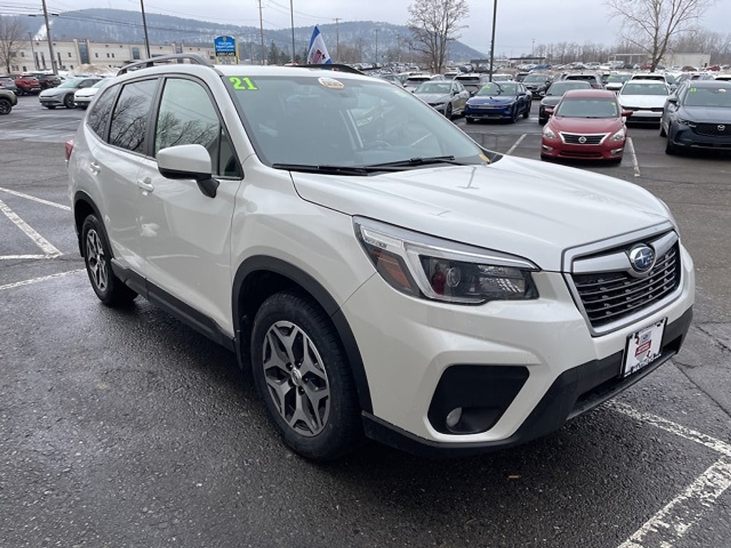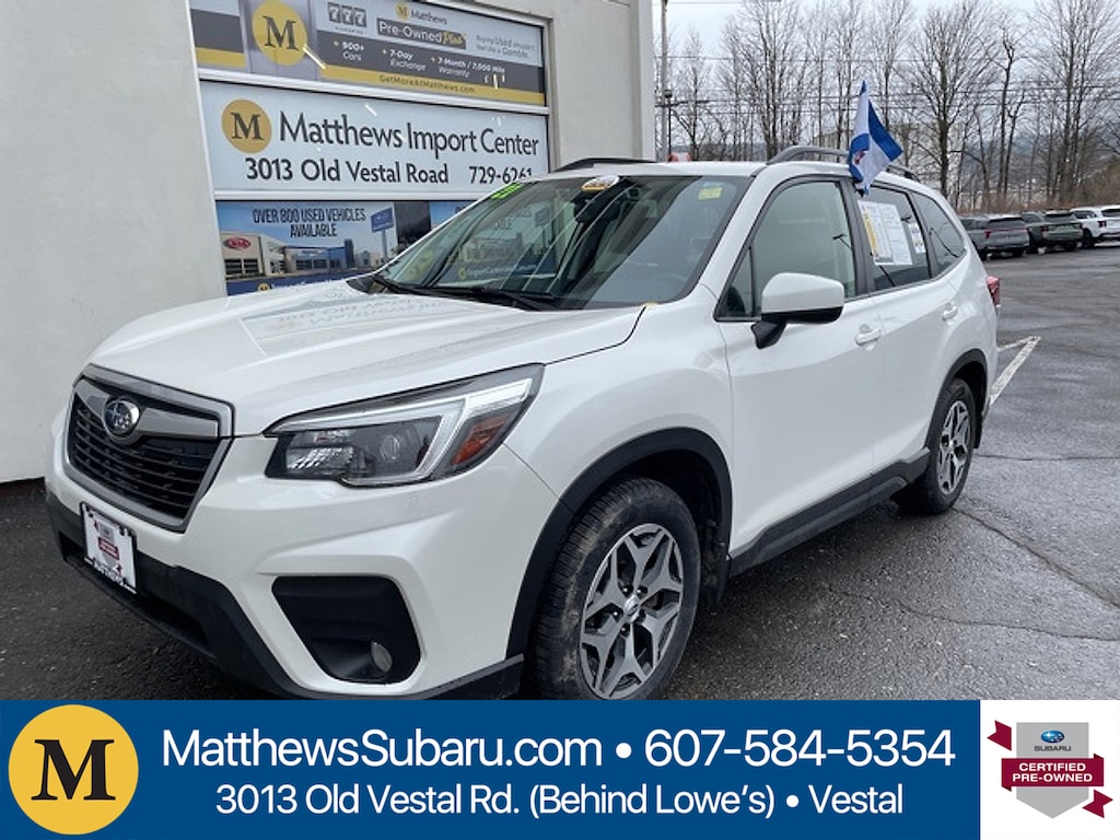 Certified. Crystal White Pearl 2021 Subaru Forester Premium AWD Lineartronic CVT 2.5L 4-Cylinder DOHC 16V VVT26/33 City/Highway MPGSubaru Certified Pre-Owned Details: * Warranty Deductible: $0 * 152 Point Inspection * Roadside Assistance * Vehicle History * Transferable Warranty * SiriusXM 3-Month trial subscription $500 Owner Loyalty coupon & 1 year trial subscription to STARLINK * Powertrain Limited Warranty: 84 Month/100000 Mile (whichever comes first) from original in-service dateMatthews Import Center promises each customer a thorough and confident 120-point inspection on our used inventory guaranteeing a relaxing and peace-of-mind experience. We are located behind Lowes in Vestal NY. Or call us at (607) 729 - 6261 Matthews Import Center 3013 Old Vestal Road Vestal NY 13850.Odometer is 4088 miles below market average!
